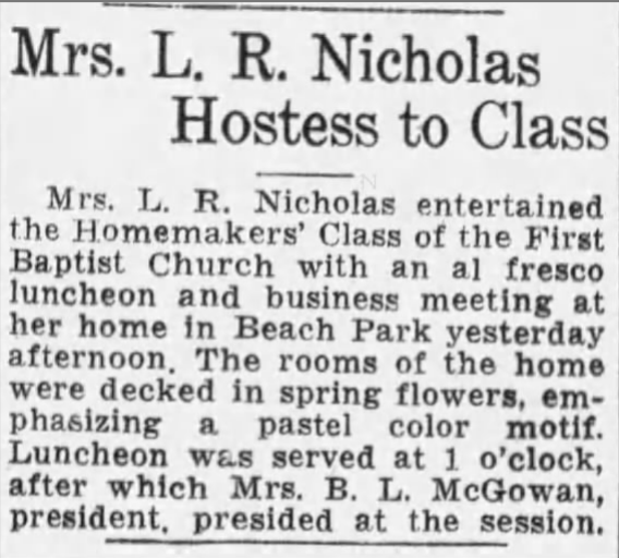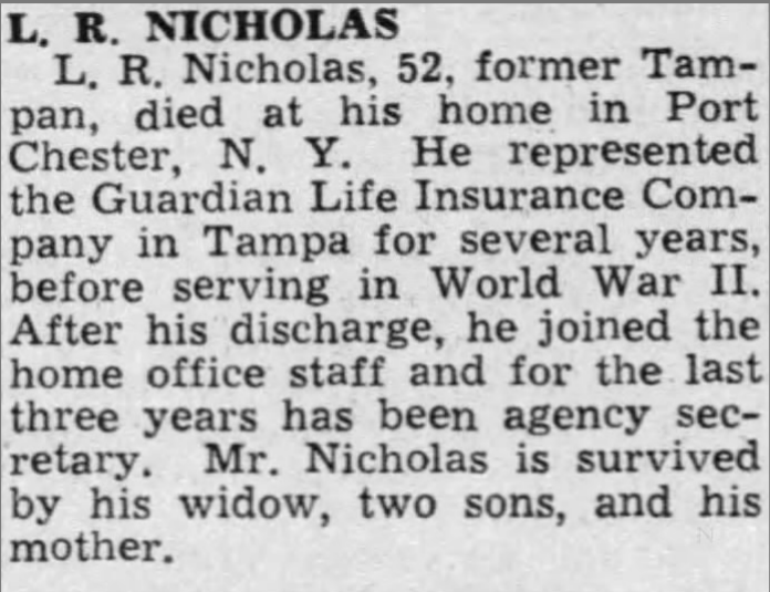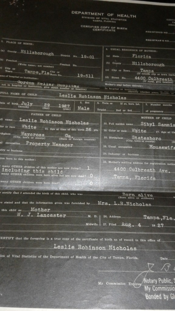 Leslie Robinson Nicholas Jr. was born on July 29, 2007 to Sybil Williams and Leslie Robinson Nicholas Sr. in Tampa, Florida. His father Leslie at the time was in a real estate business called Nicholas Realty Company. His mother Sybil was a stay at home mom and was a member of the First Baptist Church and Homemakers’ Club. Leslie was said to have been called Rob or Les and possibly Robert. For the sake of this article I will refer to Leslie Nicholas Jr. as Leslie and his father as Leslie Sr.