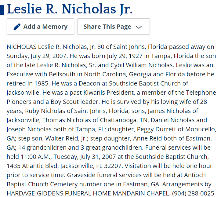 In 1950 Leslie married Margurite Queen in Jacksonville. It was around 1951 when Leslie pursued a career in management at Southern Bell. Leslie and his family moved to North Carolina in the early 1950s where he continued his career at Southern Bell in management. On August 21, 1950 Leslie and Margurite had their first child named Lynn. On March 19, 1952 Leslie and Margurite had their second child named Margurite Melissa Nicholas. On April 22, 1954 Leslie and Margurite had a third child named James Robinson Nicholas. On July 22, 1956 Leslie and Margurite had a fourth child named William Alexander Nicholas. On July 9, 1959 Leslie and Margurite had a fifth child named Thomas Leslie Nicholas. On October 3, 1963 Leslie and Margurite had a sixth child named Daniel Andrew Nicholas. In 1964 Leslie and Margurite had a seventh child named Joseph Edward Nicholas. Leslie, growing up as an only child and son of an only child as well, ended up having seven children with Margurite.