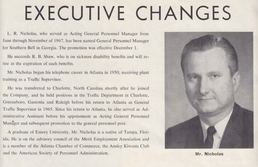 Leslie was a manager at Southern Bell first in Gastonia. Leslie moved his family a number of times due to his job from Gastonia (near Charlotte), to Winston-Salem, and then Asheville. The moving around may have taken a toll on Leslie’s marriage and it is rumored that he was unfaithful to Margurite. In 1969 Leslie moved for a final time to Atlanta at the Southern Bell corporate headquarters where he was a General Personnel Manager for Georgia Operations of Southern Bell. Leslie was also on the Business Advisory Committee of the Atlanta Chamber of Commerce.